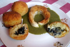 Elkészítem a mártást: a 25-30 dkg medvehagyma levelét megmosom, 1-2 apróra vágott krumpli társaságában vajon, kevés víz hozzáadásával a krumpli puhulásáig párolom. Tejszínt és kevés borsot, sót adva hozzá, mixerben pépesítem – kiforralom.
