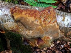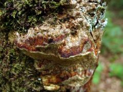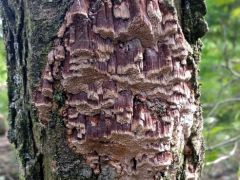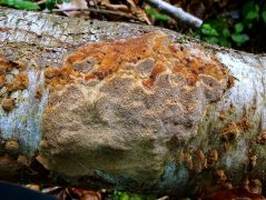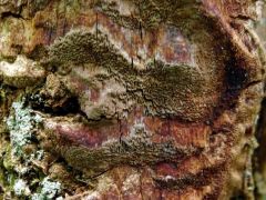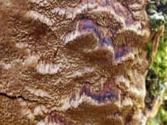 Termőtest: évelő; reszupinátus (aljzathoz simuló), de függőleges szubsztrátumon (vízszintesen is) gyakran képez kalapszerű, csökevényes kezdeményeket (álkalapokat); növekedésben levő, steril széle fahéjbarna, különösen több termőtest összeolvadása után vörösbarna, némi bíbor árnyalattal. Erőteljes fehérkorhasztó; parazita, majd szaprobionta.