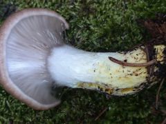 Tönk: 5-9 cm hosszú, 1-3 cm vastag, hengeres vagy lefelé kissé elvékonyodó. Fehéres, majd piszkosszürkés vagy barnás, alja élénksárga, vastag nyálkaréteg borítja. A fiatal gombánál a kalap szélét a tönkkel nyálkás burok köti össze, amely elszakad és a tönkön egy gallérzóna maradhat.