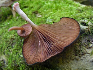 Gyakran mondjuk, hogy bizonyos fajok „bakancslistások”. Ám ezt csak akkor használjuk, ha tudjuk, mit is szeretnék találni. Az Arrhenia discorosea létezéséről azonban nem is tudtam, amíg 2015-ben egy kiránduláson meg nem pillantottam. Épp pihenőnket tartottuk, mikor megakadt a szemem egy nagyon öreg, vastag, kidőlt fán. Messziről látszott, hogy nem a napokban adta meg magát, hisz a fekvő törzset vastagon borította a moha és alatta itt-ott, már széteső félben volt a faanyag. Sosem hagyom ki, hogy az ilyen korhadékokat megnézzem. Tapasztalatból tudom, rengeteg kincset rejtenek. Dolgomat nem könnyítette meg, hogy egy dagonya közepén feküdt, de ilyen apróságok nem tartanak vissza egy kíváncsi, vérbeli gombászt. Ahogy közeledtem, feltűnt, hogy valami érdekes, sötét rózsás színű gomba gubbaszt a moha között. Bevallom férfiasan, első (sőt második és harmadik) ránézésre még nemzetség szinten sem tudtam besorolni. Bemélyedő közepe, lefutó lemezei leginkább egy tölcsérgombára emlékeztettek. Ám a fiatalabb termőtestek feltűnő húsrózsás színe és a fekete lemezélek teljes bizonytalanságot okoztak nekem. Miután alaposan körbefotóztam, termőtest mintát vettem magamhoz. A gomba meghatározásában tapasztalt gombásztársaim, Lukács Zoltán és Albert László segítettek, mindketten Omphalina discorosea-nak határozták a gombát.