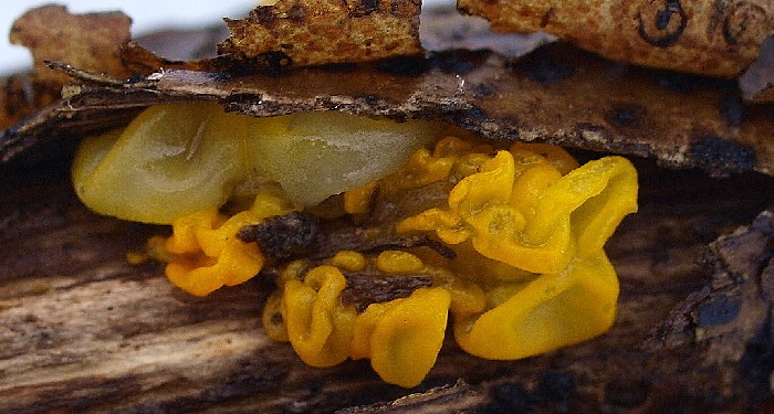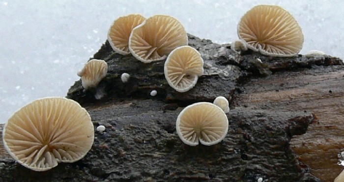 A következő hétvégét (2010. február 20-21.) ismét Miskolcon töltöttük, most a kocsonyafesztivál volt a mézesmadzag. Délelőtt elindultunk a Szinva patakhoz, remélve, hogy a víz közelsége a zord hidegben más klímát biztosít a környezetének és itt is jelét láthatjuk gombaéletnek. A vízparti öreg kidőlt és még lábon álló fűzfákat, bodzákat nézegettük, és a hámló kéreg alatt, valamint a fatörzset borító moha rejtekében bizony két érdekes gombára is rábukkantunk. A leheletvékony, fehér kígyógomba faj fényképezésekor még a lélegzetemet is visszatartottam, nehogy megsérüljön a törékeny kis jószág.
