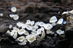 S hogy le ne maradjak Vali mögött gyorsan én is találtam egy másik korhadt fadarabot, melyen százával ültek az apró „patyolatfehér csészegombák" (Lachnum virgineum) Ezek az apró 0,5-2 mm átmérőjű, fehér tömlősgombák egész évben teremnek elhalt faanyagon, fenyőtobozon. Csészéjük tejfehér színű, külső oldaluk és apró, 2 mm-es nyelük szőrös.