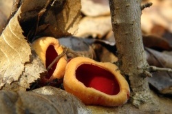 A fagyos vasárnap reggelen 2011. március 6-án hiú reménynek tűnt, hogy piros csészegombán kívül más gombával is találkozzunk az erdőben. Mi azért mindent megtettünk, hogy ez ne így legyen. Gombacsalogatónak a földről felemelt ágdarabon, melyen úgy ült a sok piros csészegomba, mint fuvolán a billentyű, eljátszottam Mozart D-dúr fuvolaversenyét is. :-)