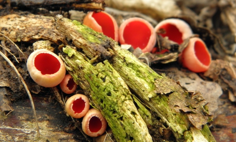 Most már csak a piros szín felfestése hiányzik a háromból. Ezt volt a legkönnyebb megtalálni! Hiszen az erdőben a piros színű osztrák csészegombák (Sarcoscypha austriaca) százai ültek a lehullott ágakon.