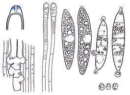 Az ivaros termőtest tömlőiben lévő spórák simák, ellipszoid alakúak, mérete 12-16 3-5 um . A spórák tartalmaznak egy vagy két olajcseppet. A tökéletlen (konídiumos) forma is termel kicsi, üvegszerűen áttetsző 3-3,5 1-2 um méretű spórákat.