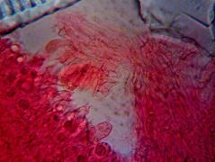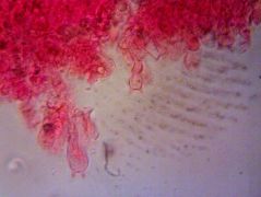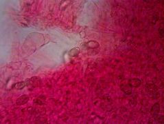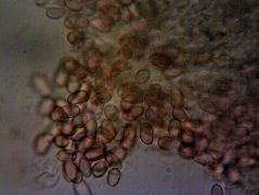 Mikroszkópos jellemzők: spórapora umbrabarna, a spórák mérete 9,3–13 × 5,3–7 µm, Melzer-reagensben sárgásszürkék, többnyire ellipszoidok, néhány enyhén mandulaformájú lehet, nincs nagy apikulusa, nem tartalmaznak cseppeket, felületük simának tűnik, de Melzer-reagensben kissé érdesek lehetnek, nem vagy csak kissé dextrinoidok, perispórium megmarad, nem szakad szét. A bazídiumok 30–45 × 7–11 µm-esek, bunkó alakúak, többnyire négyspórások. Keilocisztídium palack alakú, a felső részen hengeres, a tövénél duzzadt, 35–65 µm hosszú × 4–7 µm a csúcsán, 4–6 µm középen és 6–13 µm széles a tövénél, olykor csúcsán megvastagodott fallal, néha szeptált és csatos; sárga szemcsével sűrűn színezett. A lemeztráma a hialintól halvány barnáig változó színű. Pileipellisz ixokutisz jellegű; epikutisz vastagsága 40-120 µm, hifái 3-7(-10) µm szélesek, simák vagy finoman krusztáltak, helyenként kocsonyásak sűrűn izodiametrikus vagy hosszúkás, sárgásbarna színű elemekkel.